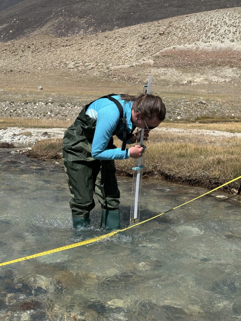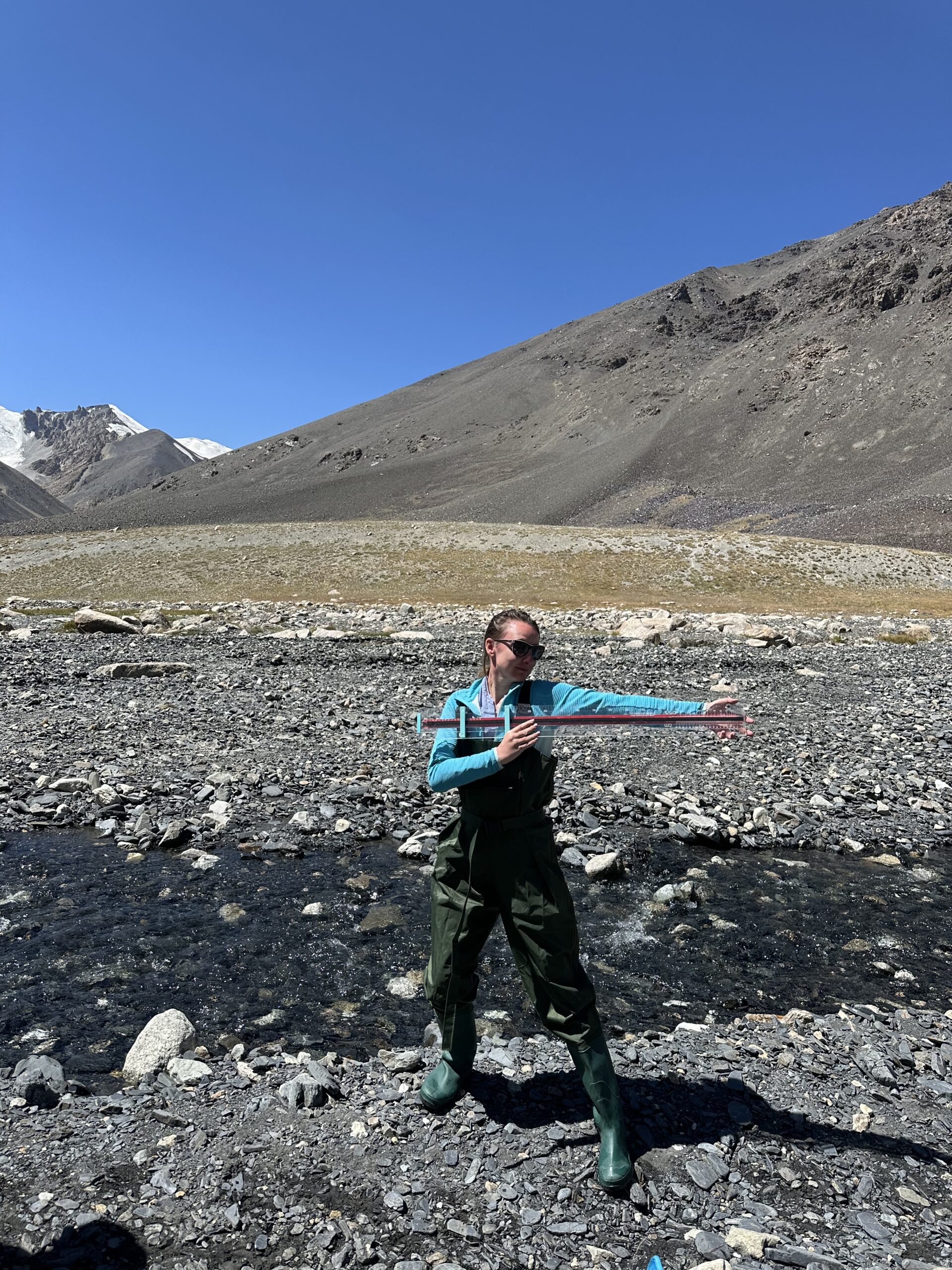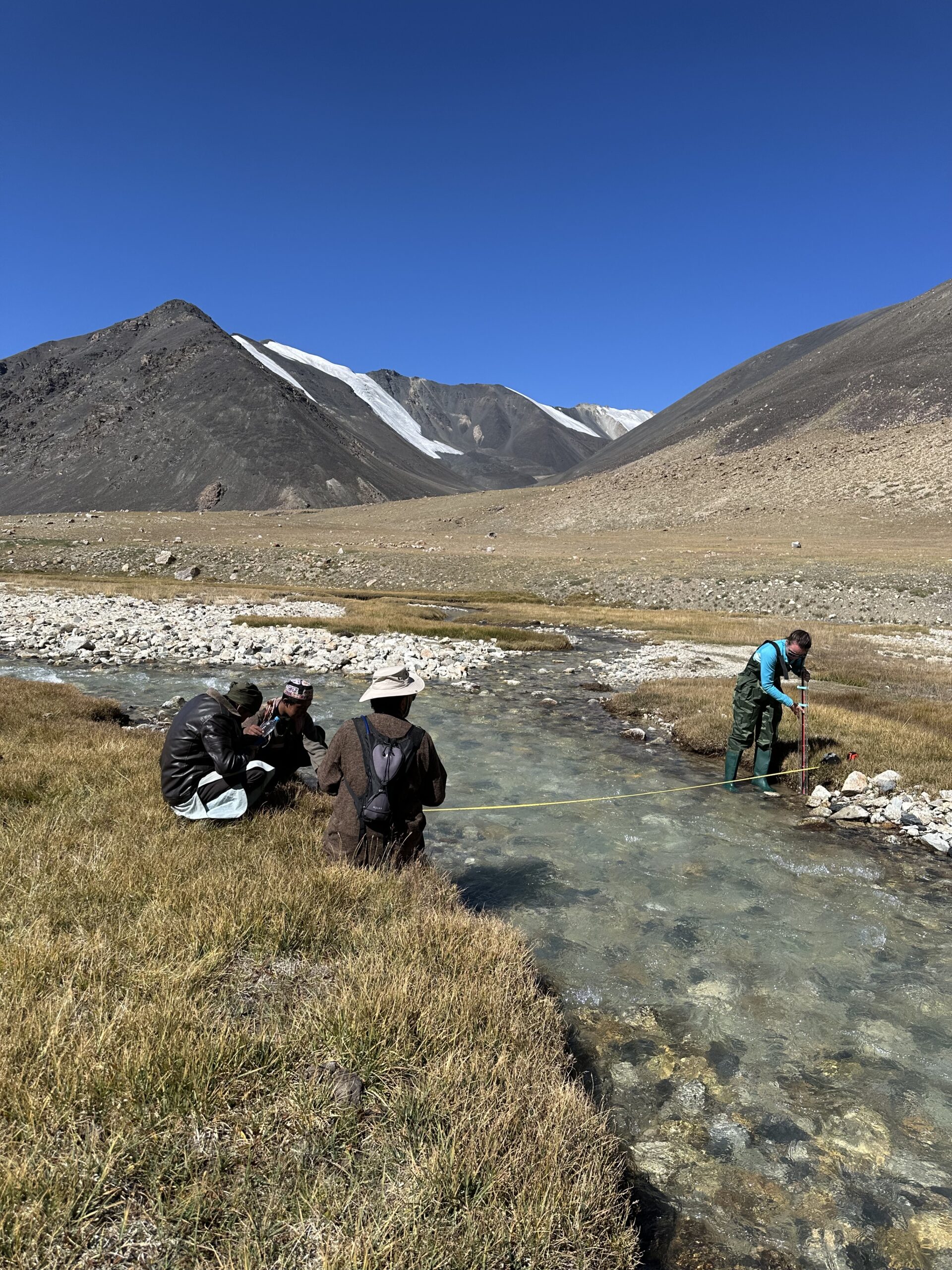 There are plenty of ways to calculate the volume of water in a stream, but we needed something which was simple to use, affordable, reliable, and wouldn’t cause consternation amongst customs officials or anyone else searching our baggage. In summer 2024 we’d trialled the trans velocity head rod (TVHR) in the UK and found it worked well in test conditions. But a quiet chalk stream running through Wilton is not the same thing as a glacial mountain stream. How would it fare? We’re delighted to say, it worked well.