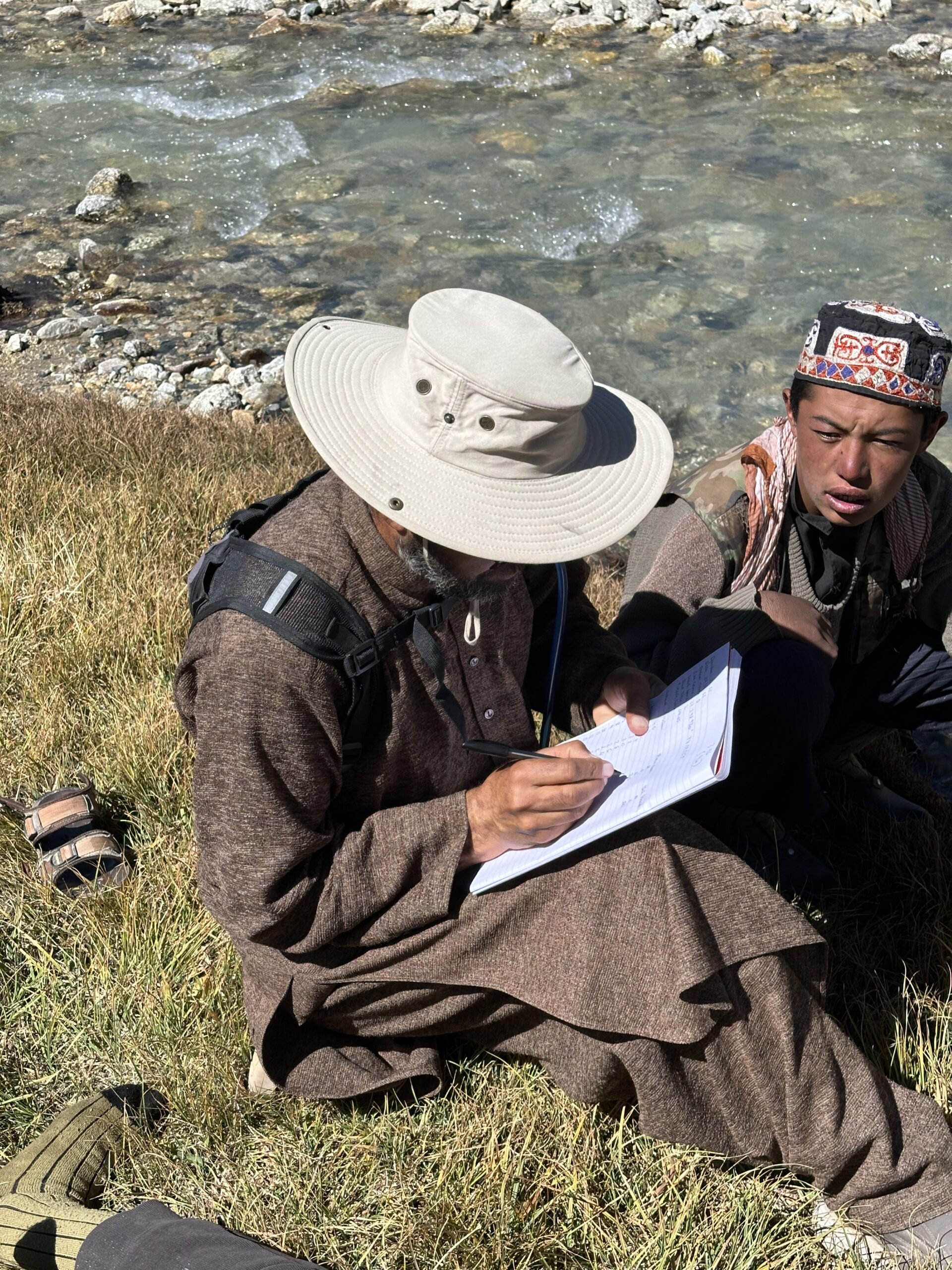 The TVHR is essentially a metre-long ruler made of perspex. You place it in the water vertically, side on to the flow, and raise the end of the clear gauge to the water’s surface to read the depth in centimetres. Then, you rotate the rod 90 degrees so the force of the water pushes against its flat side: there is a clear difference now between the water level on the upstream and downstream side of the rod. You slide the red gauge up to match the upstream water level, and then read off the velocity head in millimetres. Our guide, Salahuddin Esmaeli, recorded the data in a table, and we repeated the process again and again across each stream’s width, collecting all the information required to calculate the cross-section of the stream and the volume of water flowing through it.